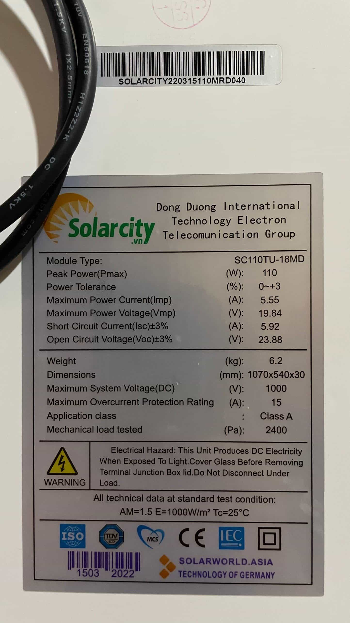 Thông số kỹ thuật TẤM PIN NĂNG LƯỢNG MẶT TRỜI MONO 110W SOLARCITY