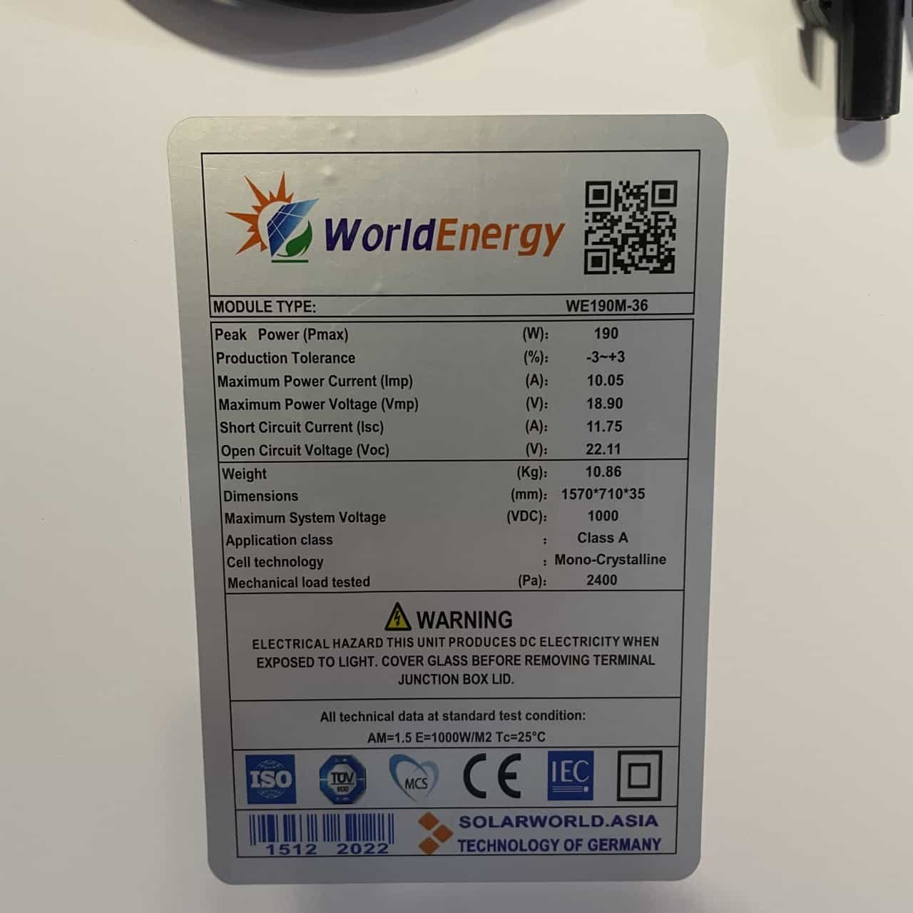 Thông số kỹ thuật TẤM PIN NĂNG LƯỢNG MẶT TRỜI MONO 190W WORLDENERGY